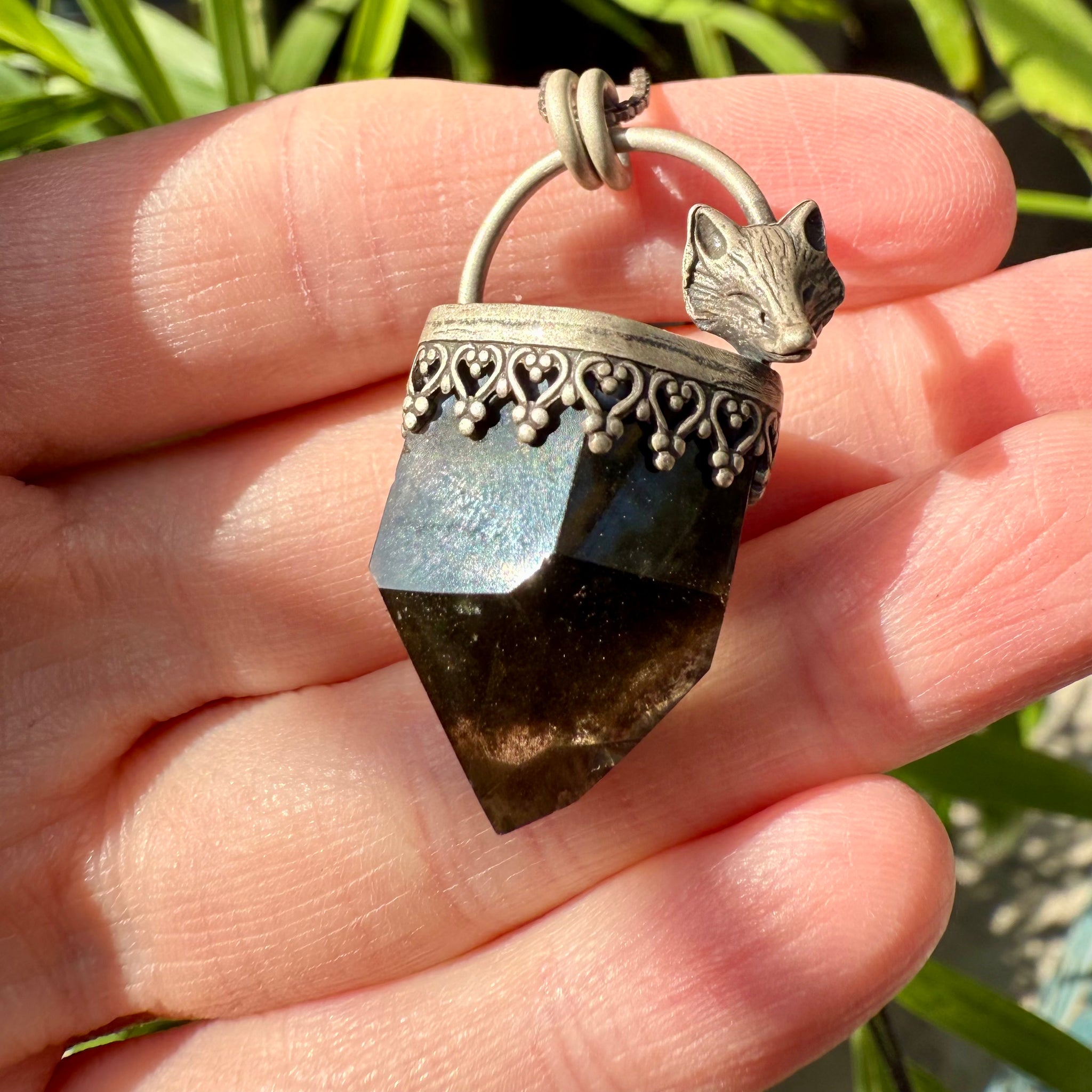 Beautiful natural garden quartz pendant. This necklace is set with a detailed hand-forged sterling silver bezel and a hand crafted fox on top. The piece has been oxidized and tumbled to give it a matte finish.