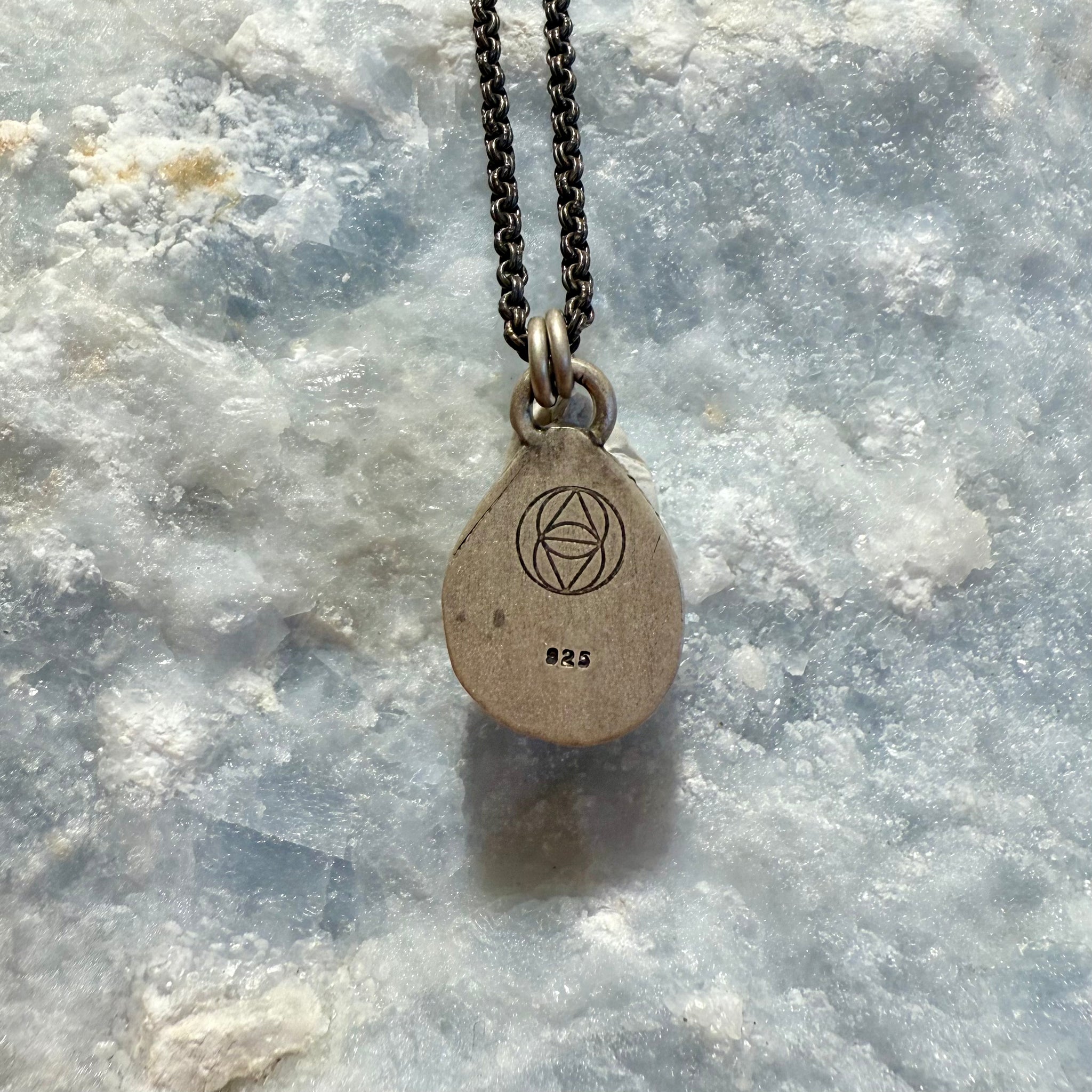 Beautiful oval cut rutilated quartz cabochon. It is set in a ornate hand-forged sterling silver bezel. The piece has been oxidized and tumbled to give it a matte finish.