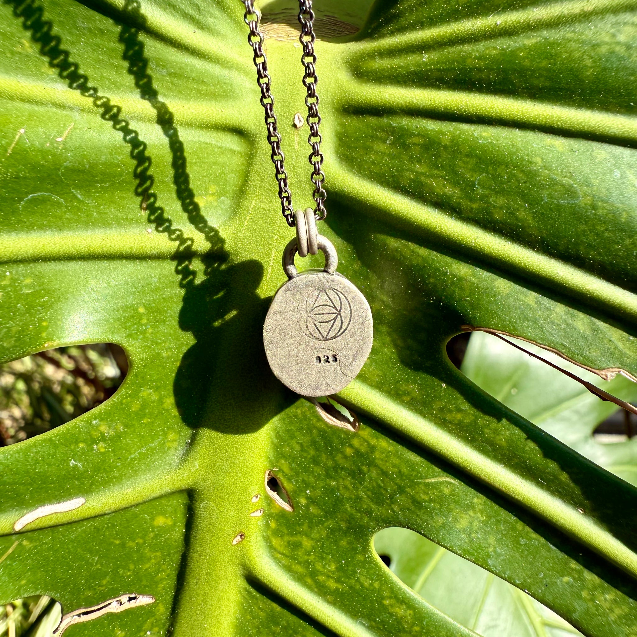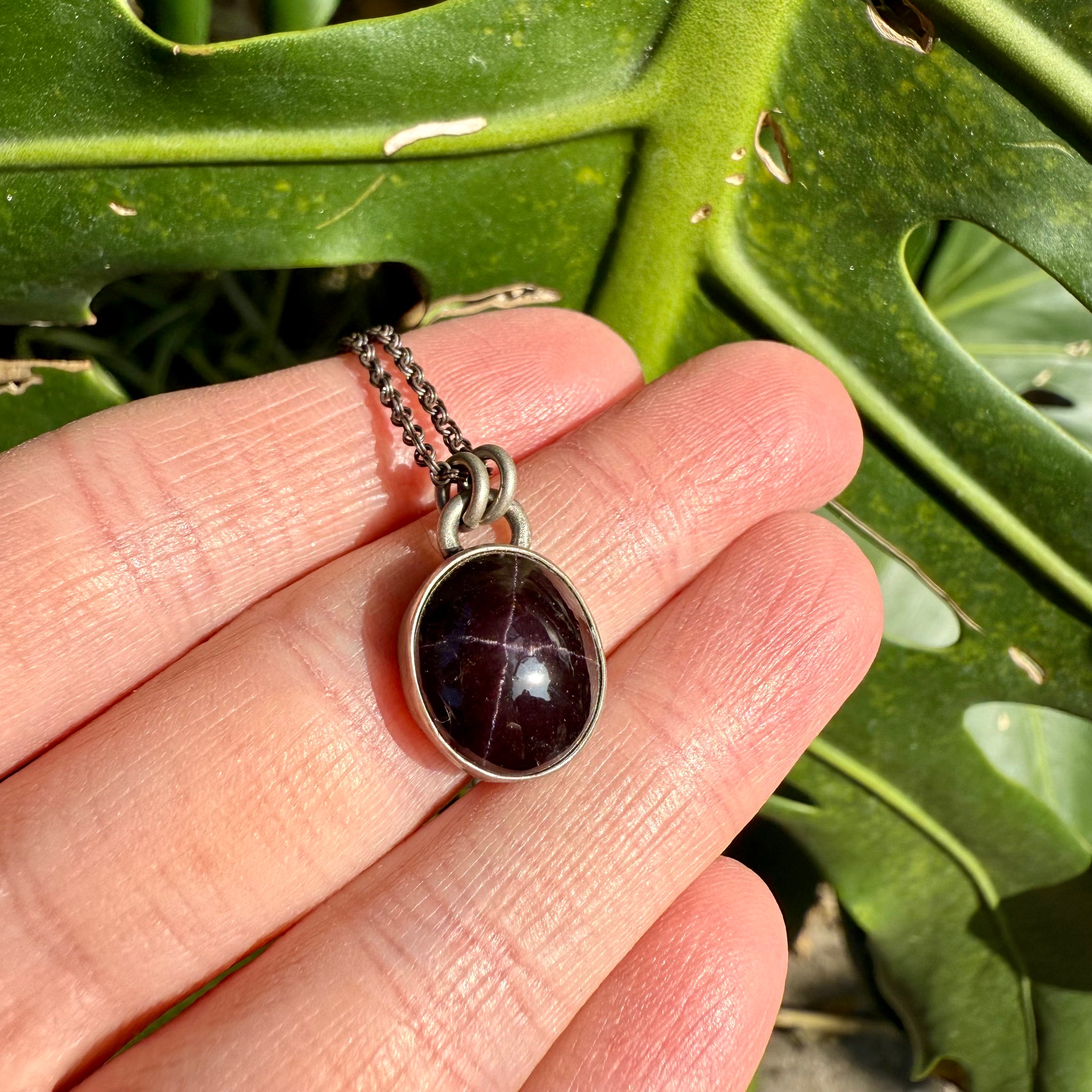 Beautiful oval cut star ruby cabochon. It is set in a simple hand-forged sterling silver bezel. The piece has been oxidized and tumbled to give it a matte finish.